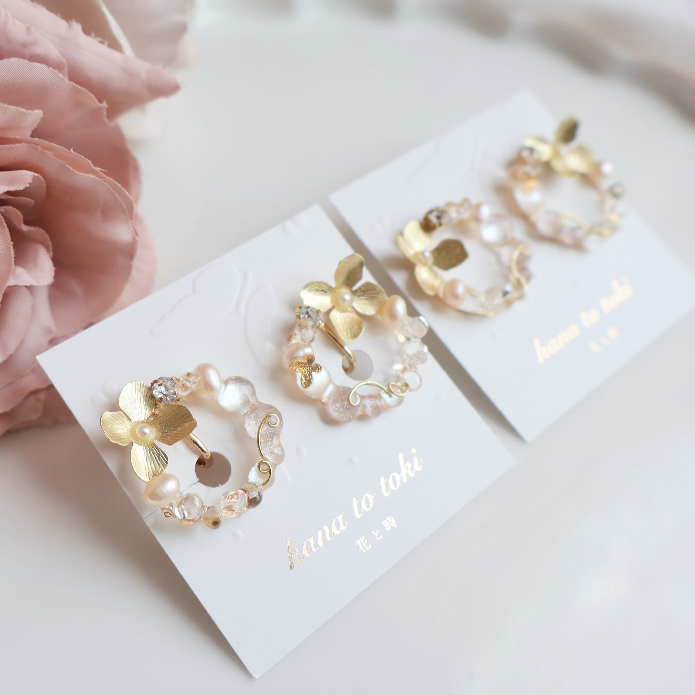 「花と時 - 輝」は、華やかなゴールドフラワーと優しいピンクベージュのパーツクラブを組み合わせた、大人可愛いアクセサリー。