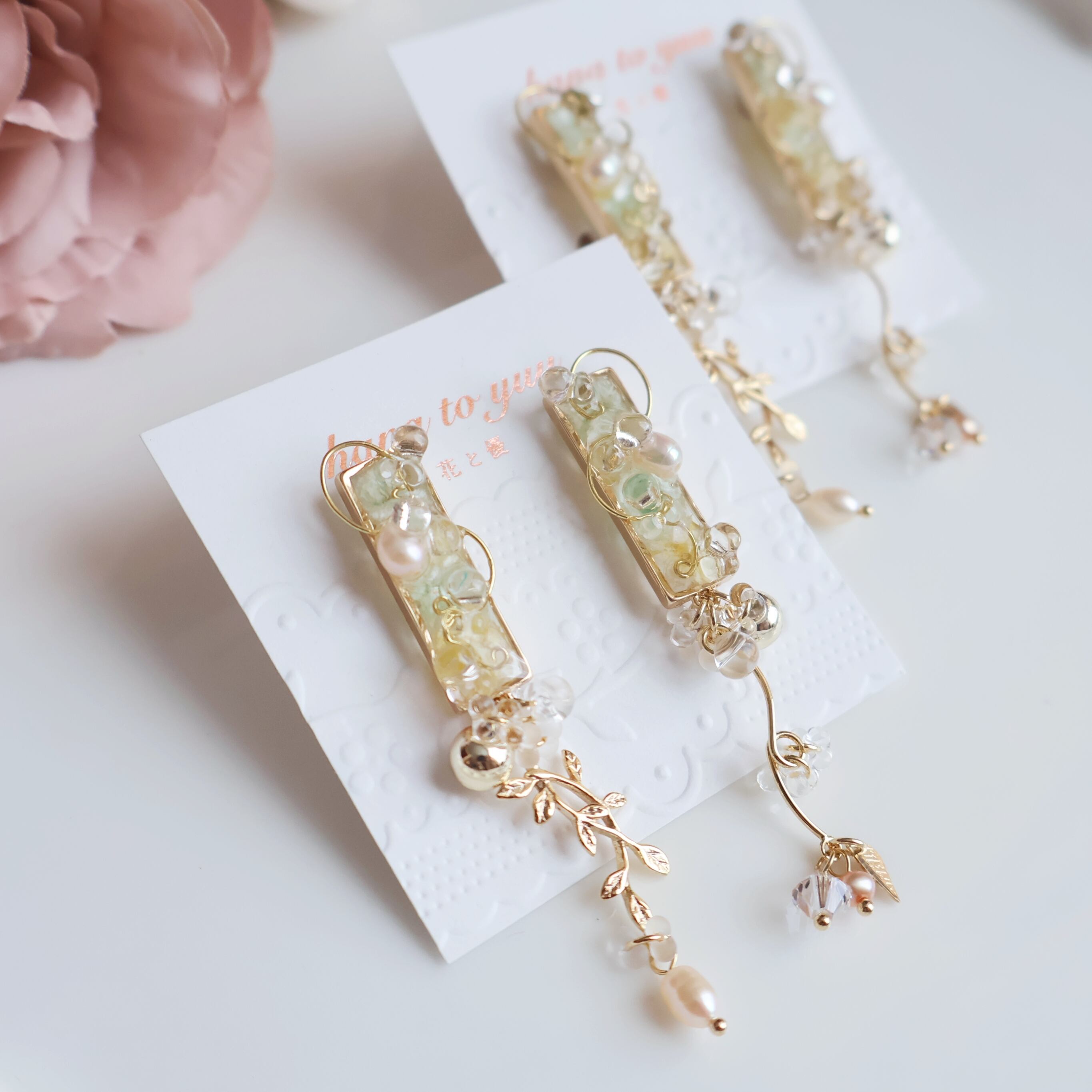 「憩(いこい)green&yellow」は、淡いチェコビーズとパールを散りばめ、葉のチャームが軽やかに揺れるデザイン。
